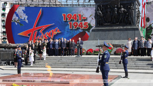 Президент подчеркнул, что в Беларуси помнят всех, кто до последнего патрона сдерживал врага на границе, под Минском и Могилевом, кто был замучен в застенках гестапо, кто сгорел в Хатыни, Дальве и Тростенце.