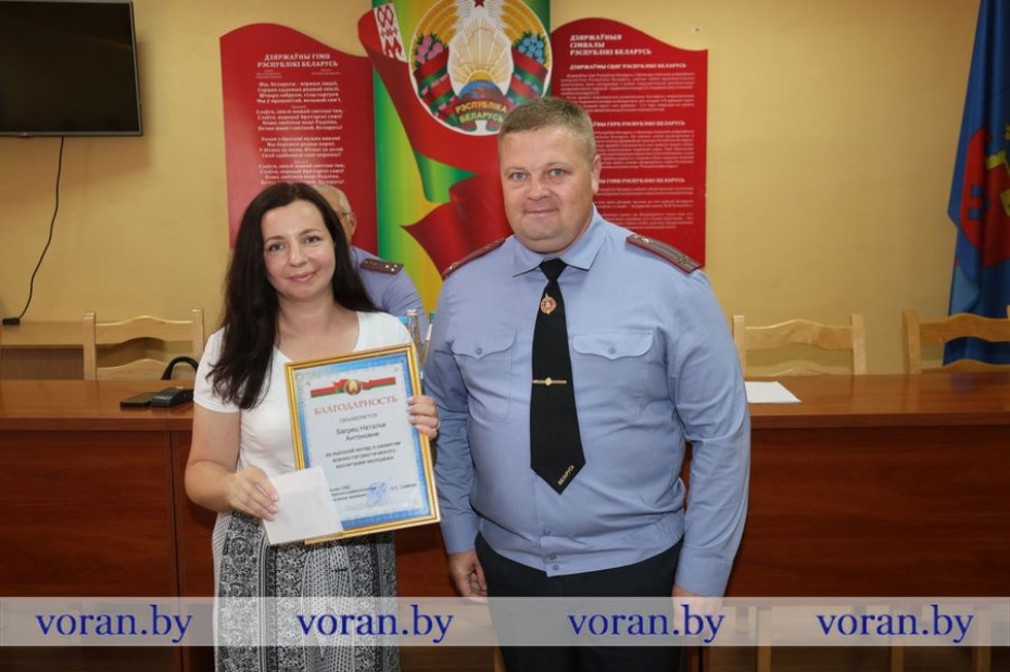 Благодарность начальника Вороновского РОВД объявлена работникам Вороновского районного центра детей и молодежи Наталье Багрец и Галине Каплун. При Центре действует военно-патриотический клуб «Стрела», над которым шефствует РОВД.