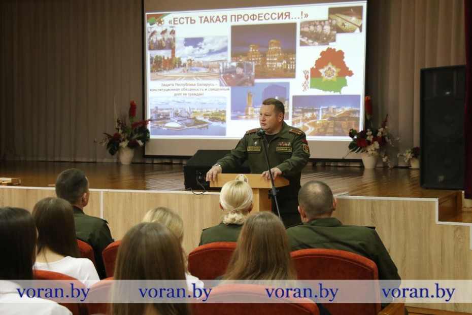 — Чтобы сохранить мир, нужно любить свою страну, быть готовым отстаивать ее независимость и границы, быть настоящим патриотом, — отметила Юлия Волоткевич, начальник группы организации отбора на военную службу военного комиссариата Гродненской области, обращаясь к школьникам. Она подчеркнула, что сегодня у ребят уникальная возможность пообщаться с курсантами ведущих военных вузов страны.